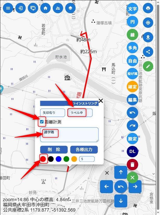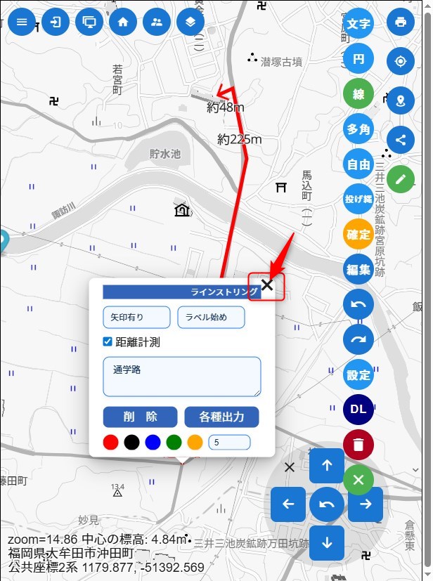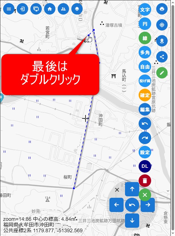 「線」を選んで、出発からゴールまでをクリックしていく