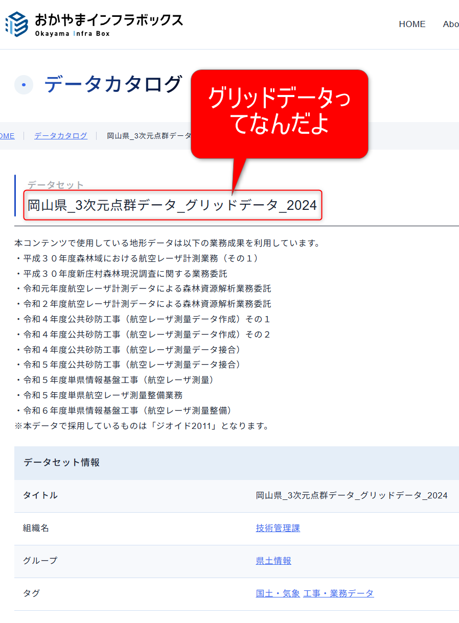 おかやまインフラボックスのグリッド点群データも、建物や樹木を取り払った地面の高さを表したデータです。