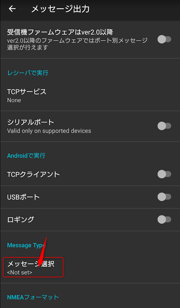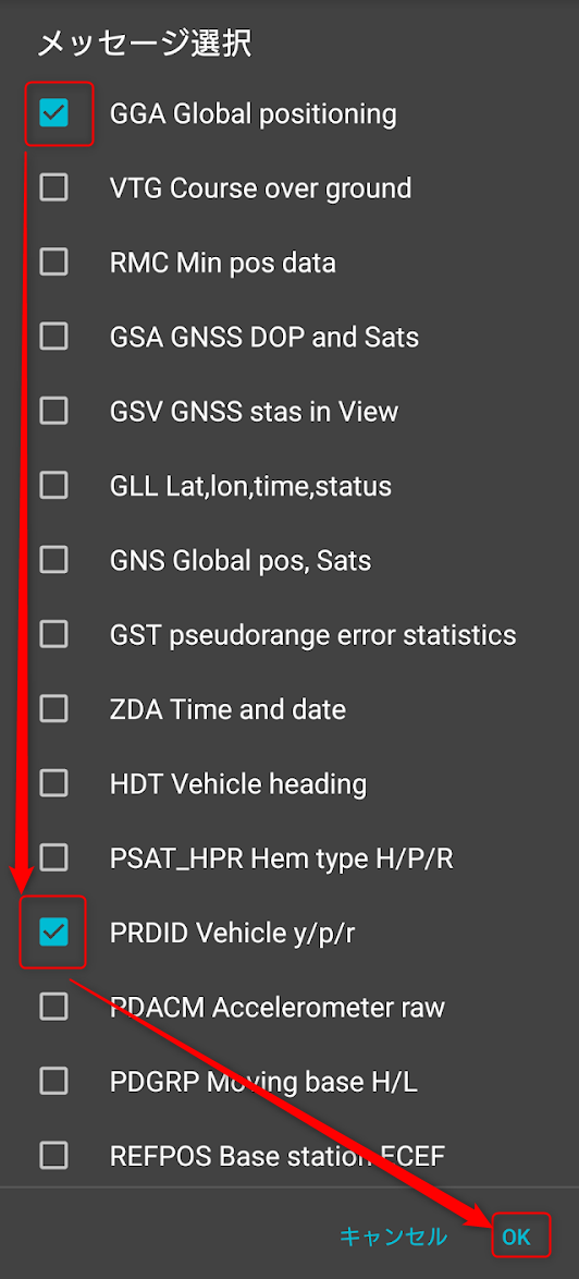 メッセージ出力[Bluetoothメッセージタイプ]でGGA Global positioningとPRDID Vehicle y/p/rを有効にする