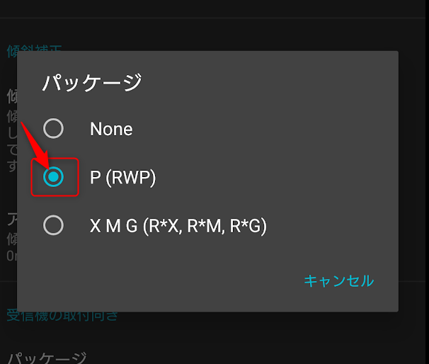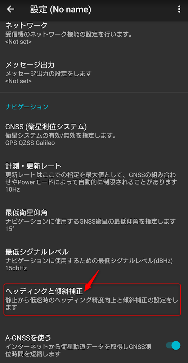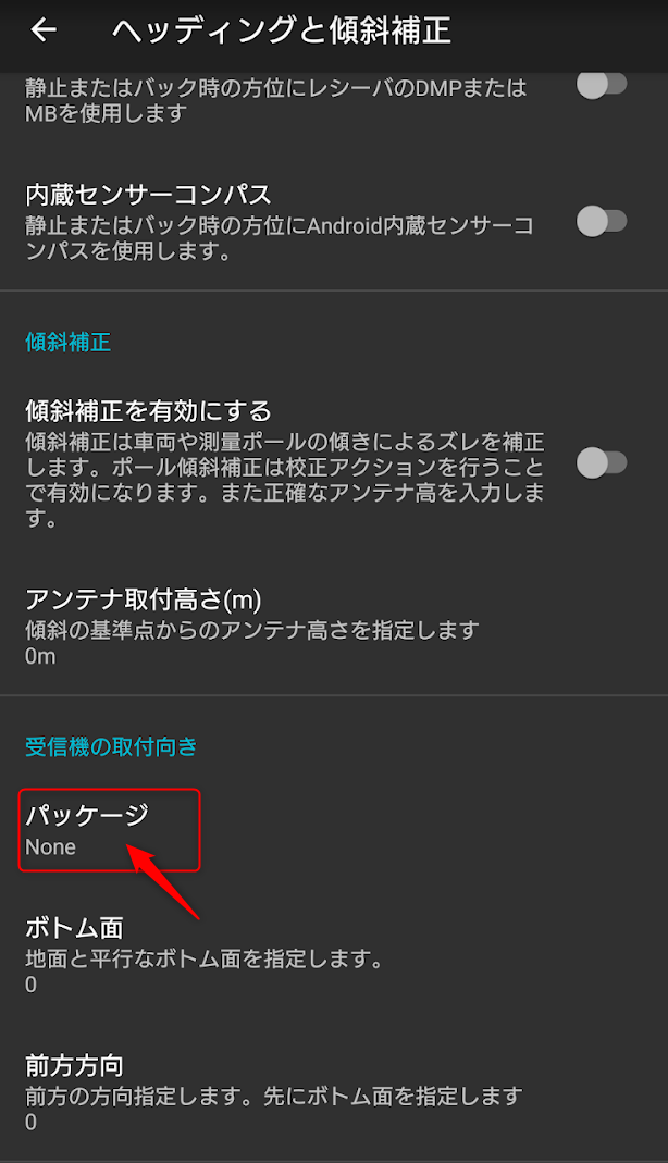 「ヘッディングと傾斜補正」→「受信機の取付向き」でPを選択
