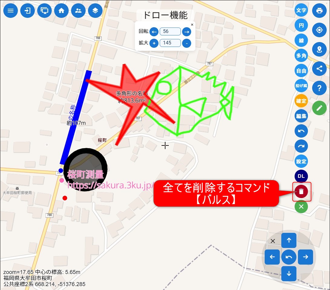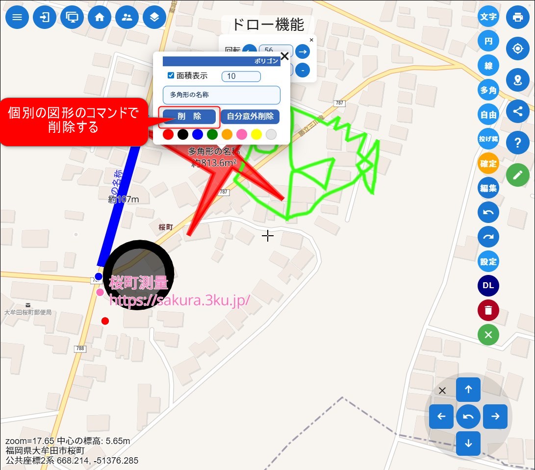 全部消えるので要注意。個別の図形を削除したいときは、個別の図形を選択した中の【削除】をクリック