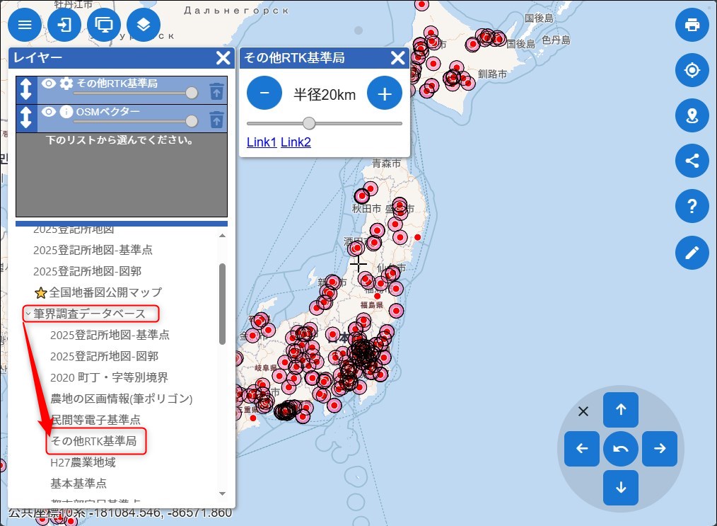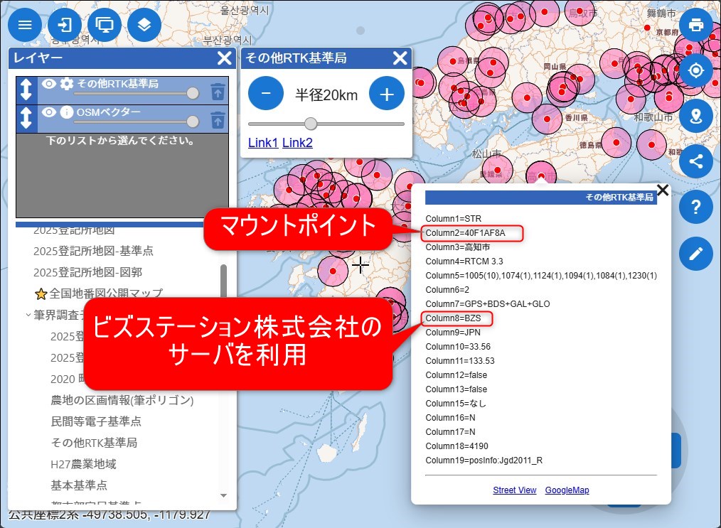 RTK基準局のプロット位置は概略なので、1Km程のズレがある場合があります。